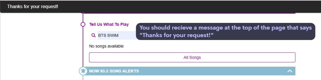 Requesting songs through song alerts on the website is different than on mobile and uses a link not connected to the iHeartRadio website. You can still save the radio stations to your Library, but you will need the link to request the song manually by typing the song into the search bar (explained in the steps below).You can come back to this guide to easily access the links to request, but YOU MUST save the station to monitor their Now Playing and tune in to the station when you recieve alerts that they play SWIM.You can access these links through your mobile web app, not just on a computer (safari, google, etc.).Some stations have song alert request forms, but aren't on iHeartRadio- you can still request and set text alerts and tune in on their website on computer or mobile.