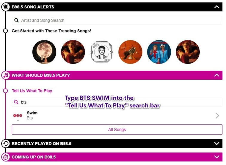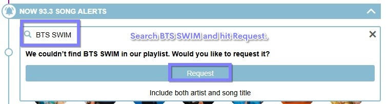 Use the red microphone button to record a request for the station and submit the request. Request the song as many times as you can throughout the day, even if they play SWIM once. The more requests made, the more likely stations will see the demand for the song and add it to their playlist regularly.Your request can be as simple as "Please play SWIM by BTS" don't overthink it!