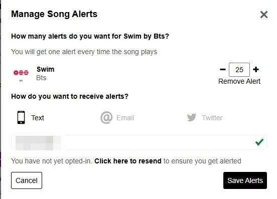Even though you set an alert while requesting in the previous step, set another alerts to give a push to the song on the radio station. I recommend using text so you can join the app or station immediately.You may not get any alerts because they haven't played the song. This is why requesting multiple times a day is key to success.