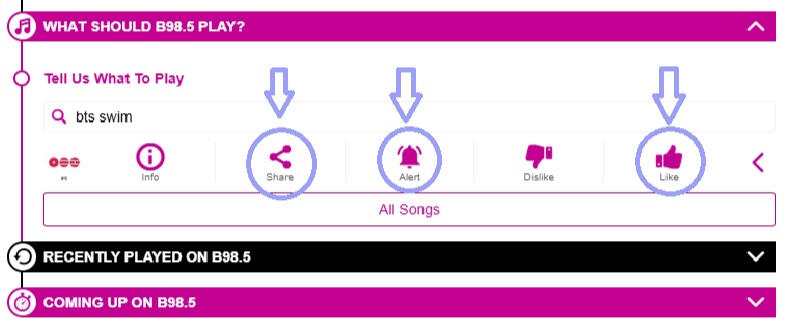 Use the red microphone button to record a request for the station and submit the request. Request the song as many times as you can throughout the day, even if they play SWIM once. The more requests made, the more likely stations will see the demand for the song and add it to their playlist regularly.Your request can be as simple as "Please play SWIM by BTS" don't overthink it!
